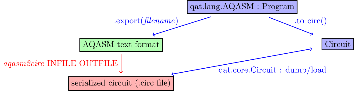 Circuitinstance and serializing it (right path in the figure)exporting your program to an .aqasm text file (human readable text format), and compiling it using the command-line tool aqasm2circ (left path in the figure)