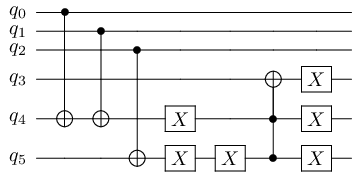 two CNOTs to compute the XOR of the first two qubits in some ancilla \(q_4\), (corresponding to the qbools[0] ^ qbools[1] term)