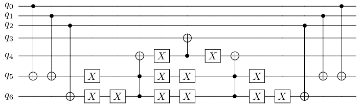 Notice that the boolean expression was first evaluated in a temporary qubit (qubit 4), then we copied the result in an output qubit (qubit 3), finally, the expression was uncomputed upon exiting the with block.