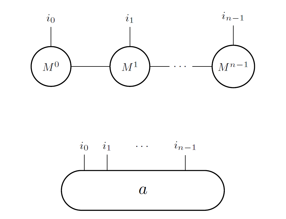 where \(\{M^{k,i_{k}}\}_{k=1\dots N}\) are matrices, with respective dimensions \(\left(\chi_{_{k-1}}, \chi_{_{k}}\right)\), consistent with matrix multiplication.