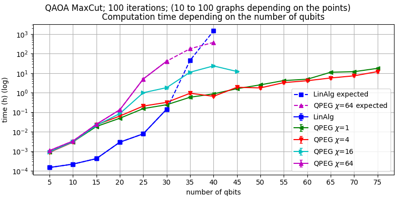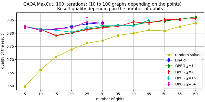 QPEG has been benchmarked on solving MaxCut problems with QAOA variational circuits. The following graphs show the quality of the result obtained with QPEG (compared to a perfect result of the problem) and the time taken by such simulations. These results are compared with LinAlg — Qaptiva’s exact simulator and with a random guess.